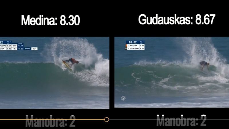 Simplesmente uma onda maior e mais longa, onde o Medina executou mais que o dobro de manobra que Gudauskas e recebeu uma nota 0.37 menor.