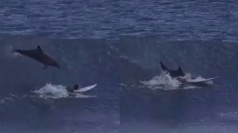 Golfinho pula e atinge surfista