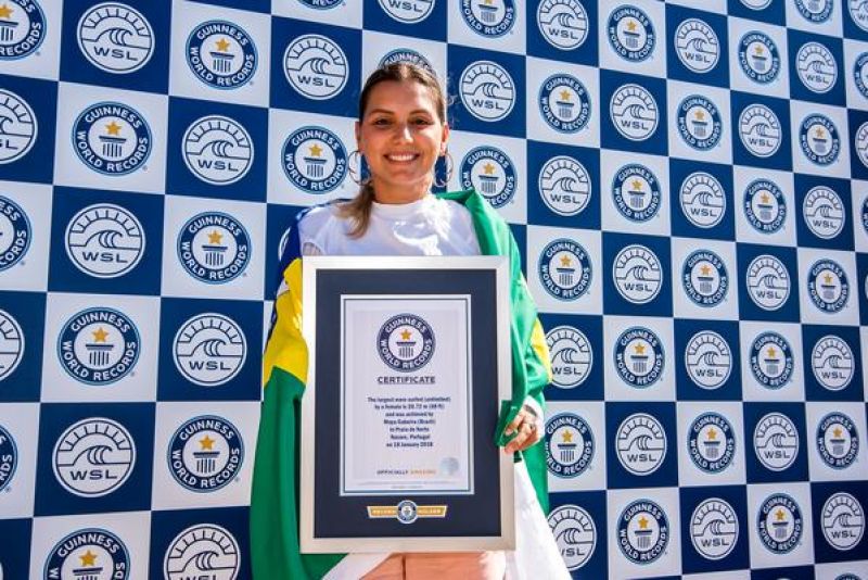 A big-rider carioca Maya Gabeira está oficialmente no livro dos recordes. A WSL concedeu, hoje (01), oficialmente o primeiro prêmio do “Women´s XXL Biggest Wave Award” a surfista brasileira, que ainda estabeleceu uma nova marca a ser registrada no Guinness World Records: a maior onda surfada por uma mulher. Maya, de 31 anos de idade, surfou uma onda medindo 68 pés, ou 20,72 metros de altura da crista até a base, no dia 18 de janeiro deste ano no famoso pico de ondas gigantes da Praia do Norte, em Nazaré, Portugal.
